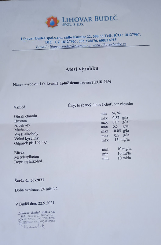 - obilný etanol kvasný, velejemný rafinovaný, úplně denaturovaný